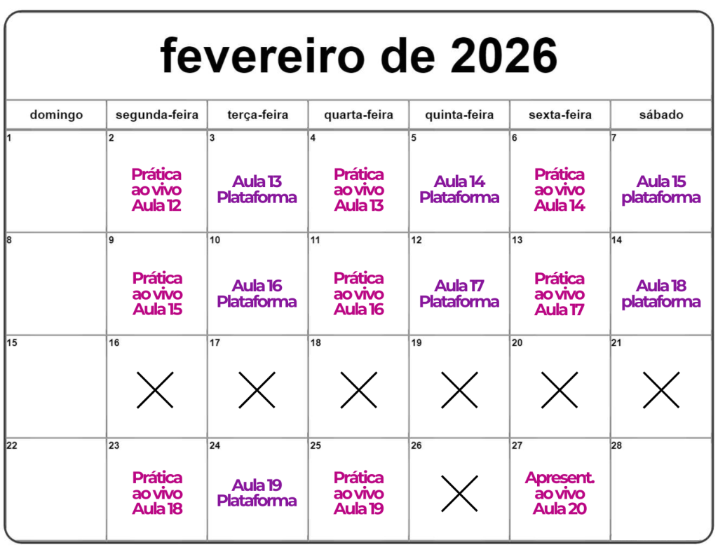 Abaixo está o exemplo de cronograma para os meses de janeiro e fevereiro de 2026.